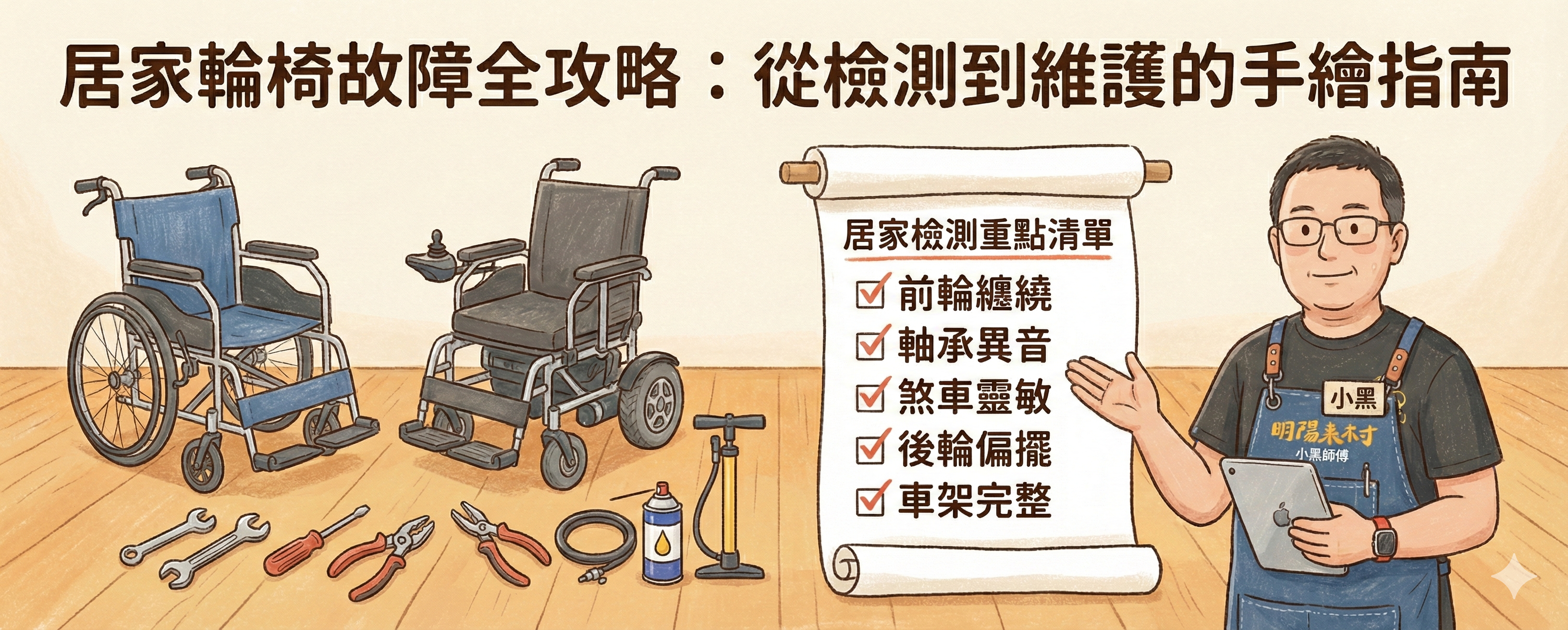 居家輪椅故障全攻略:從檢測到維護的深度指南 輪椅對於行動不便的長者或身障者而言,就如同他們的「雙腳」。一旦雙腳出現問題,不僅影響行動效率,更潛藏著翻車、跌倒等嚴重的安全隱憂。居家照護中,我們常聽到家屬抱怨輪椅變難推或有異音,這些往往是零件損耗的警訊。維修技師小黑 將針對輪椅的常見故障,提供更系統化的檢測邏輯與日常照護知識。一、 三大核心檢測法:聽、感、看當輪椅出現異常時,我們可以透過「異常聲音」、「異常振動」、「外觀差異」這三個直覺指標來初步判斷病灶。1. 聽:捕捉不尋常的「求救訊號」• 金屬摩擦聲: 若在推行時發出尖銳的「吱吱」聲,通常是軸承(培林)損秏或進水生鏽,也可能是剎車皮與輪圈過近產生的摩擦。• 鬆脫撞擊聲: 經過顛簸路面時若有「喀拉」聲,請檢查腳踏板、扶手或折疊關節處的螺絲是否已經鬆動。2. 感:察覺推行時的「阻力與抖動」• 方向偏移: 在平整地面推行,若輪椅自動向左或向右偏,可能是前輪軸承損壞,或是車架已微幅變形。• 前輪狂抖: 雖然空車推行時前輪轉動是正常的,但若承載使用者時前輪仍劇烈擺動(俗稱「蛇行」),則可能是前輪組的前叉過鬆或是培林損毀。• 煞車力道減弱: 這是最危險的情況。當煞車桿壓下後,輪椅仍能輕易推動,代表煞車塊磨損或位置偏移,必須立即處理。3. 看:觀察幾何形狀的「不對稱」• 輪框偏擺: 轉動大輪,從正面觀察輪圈是否呈「S型」晃動。輪框變形會導致煞車失效且推行費力。• 車架歪斜: 將輪椅放在平地,觀察左右扶手高度是否一致、X型交叉桿是否有裂痕。• 輪胎磨耗: 檢查胎紋是否平整。若輪胎出現龜裂或變薄,抓地力會大幅下降,尤其在浴室或磁磚地上極易打滑。 二、 居家檢測重點清單 (Checklist)家屬可以每個月進行一次簡單的「五分鐘健檢」:三、 為什麼「檢測在居家,維修找專業」?許多家屬會嘗試用家裡的板手自行修理,但我們強烈建議僅進行檢測與簡單清潔,原因有三:1. 專用工具需求: 輪椅許多螺絲是特殊規格(如英制規格或防鬆螺帽),使用錯誤工具會導致螺絲滑牙,反而增加維修難度。2. 安全性考量: 煞車與折疊機構涉及精密力學。調整不當可能導致在斜坡上煞車失靈,後果不堪設想。3. 零件備品: 專業維修人員能提供原廠零件,確保耐用度。多數居家常見問題(如更換軸承、調整煞車)其實都能在現場完成。 四、 延長輪椅壽命的日常保養小撇步• 避開水氣: 清潔輪椅建議用濕布擦拭後隨即抹乾,避免直接用水沖洗導致車架內部生鏽。• 毛髮清理: 前輪小輪極易纏繞毛髮,這是異音與推行不順的主因。養成定期用鑷子或小刀清理軸心毛髮的習慣。• 正確收合: 收合輪椅時應提起座墊中心,避免暴力拉扯扶手導致車架變形。 結語:安全,是唯一的標準輪椅不只是交通工具,更是長輩自尊與行動自由的延伸。當您聽到「怪聲」或感覺「難推」時,千萬不要抱著「還能用就繼續用」的心態。預防勝於治療,定期的居家檢測與專業的年度保養,不僅能延長輪椅的使用壽命,更能守護家人的安全。畢竟,乘坐者的安全永遠是照護路上第一考量的核心。 維修服務專區 維修預約