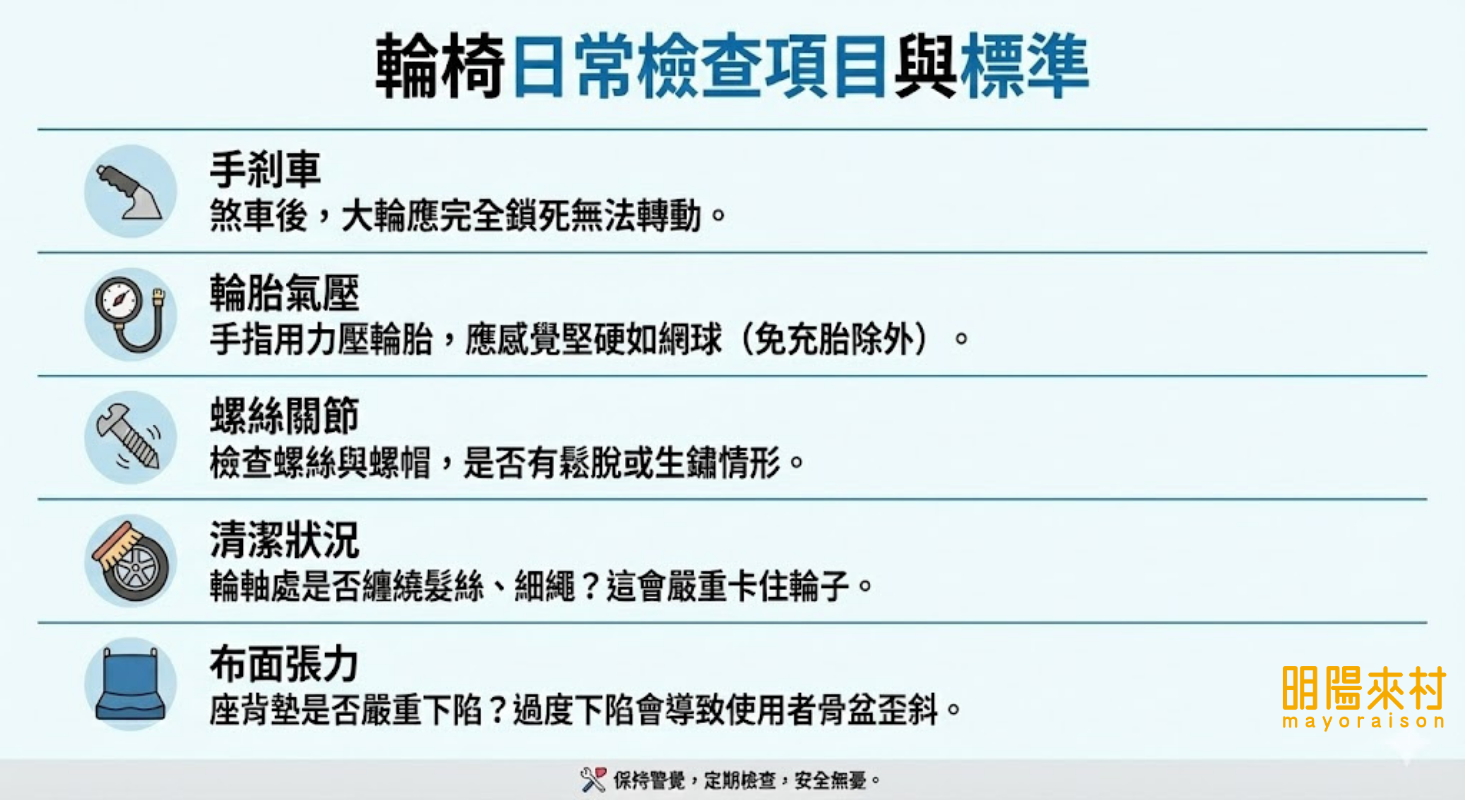 預防勝於治療,定期的居家檢測與專業的年度保養,不僅能延長輪椅的使用壽命,更能守護家人的安全。畢竟,乘坐者的安全永遠是照護路上第一考量的核心。