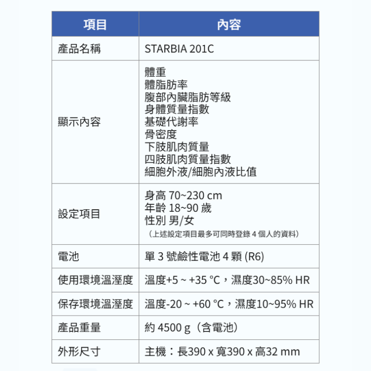 STARBIA201C 體組成分析儀為便攜式家用人體組成檢測系統,適合各年齡層家庭成員使用。